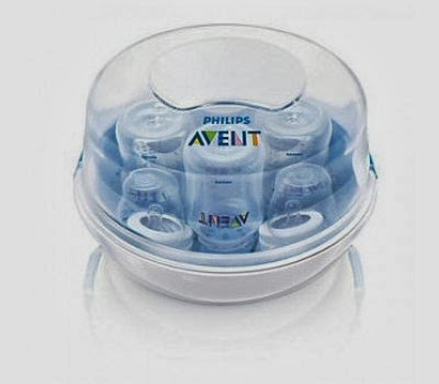 Esterilizador de mamadeiras: Importantíssimo, pois é um horror ficar fervendo mamadeira. Eu comprei um kit da Avent que vinha com tudo, mamadeira, aquecedor, esterilizador, chupeta e até um potinho com três compartimentos para as doses de leite em pó. Tudo isso mais barato do que somente o esterilizador custava no Brasil.